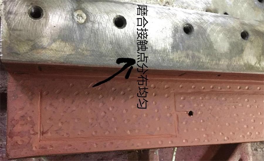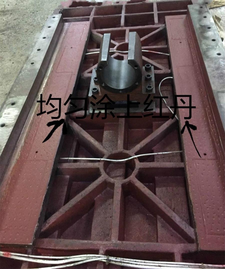 1、工作臺(tái)刮渣片全部拆掉,工作臺(tái)耐磨皮安裝面用氣槍吹干凈,汽油清洗干凈,均勻的涂上紅丹油。導(dǎo)軌面用汽油清洗干凈。