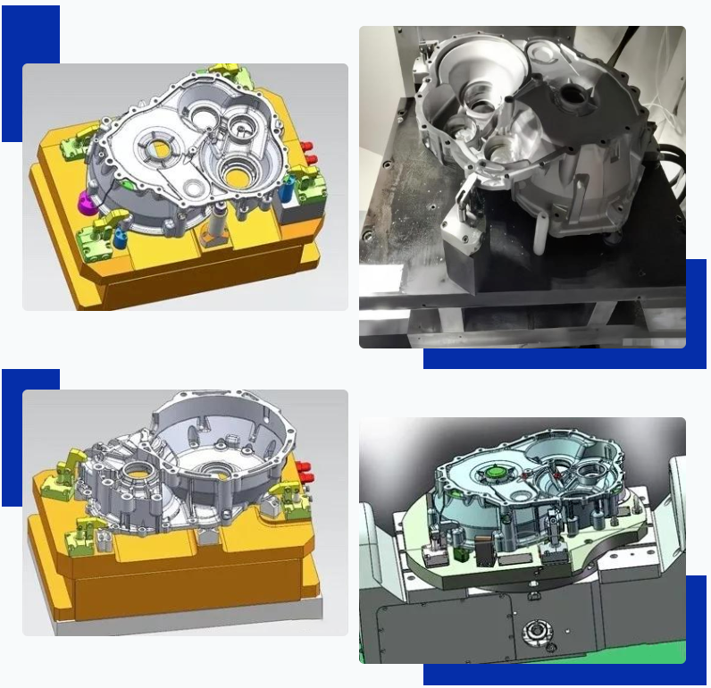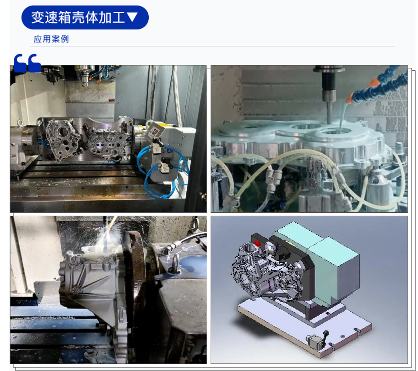 新能源汽車的變速箱殼體,材料為鑄鋁,主要做鉆孔、銑孔、攻牙、鏜孔等工序。此類產(chǎn)品重要孔位尺寸精度0.01mm左右,孔壁粗糙度要求Ra1.6平面度要求0.03~0.05mm孔同心度要求0.01~0.15mm。加工工藝一般是用夾具定位先做正反兩面,然后四軸加工產(chǎn)品四周的孔位,根據(jù)產(chǎn)品的外形尺寸此類產(chǎn)品多用V85或(V857+四五軸)等設(shè)備加工。(機(jī)床要求,尺寸精度要穩(wěn)定,加工效率要高)